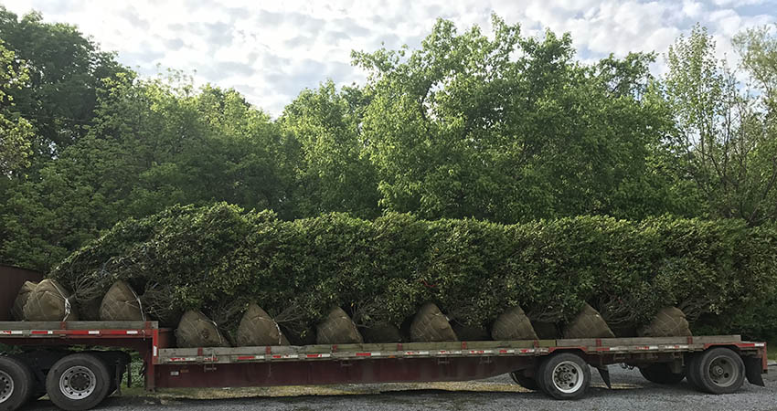 Once we have a location picked, we will bring the truck to the site and dig the plug of dirt where the tree will go. We take that dirt to the nursery where we dump it and then dig the tree. Once the tree has been tarped and secured for travel, we will bring it to your site and set the tree in the open hole. We can also order full landscape shipments. From shrubs, bushes, and small trees, we can bring whatever plant material you need to your property!